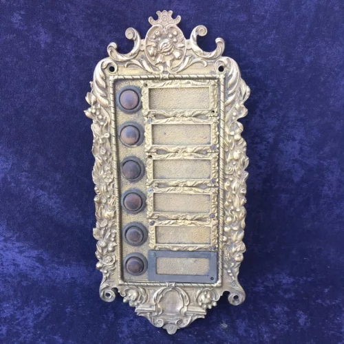 Klingelplatte Nr. 6 mit 6 Namensfelder Historismus Messing