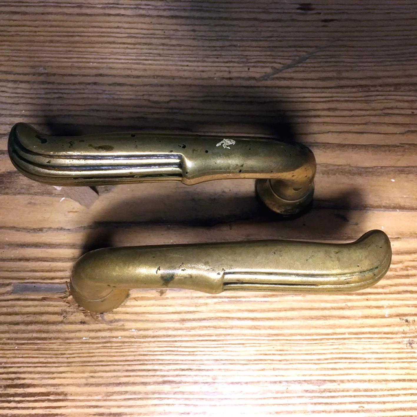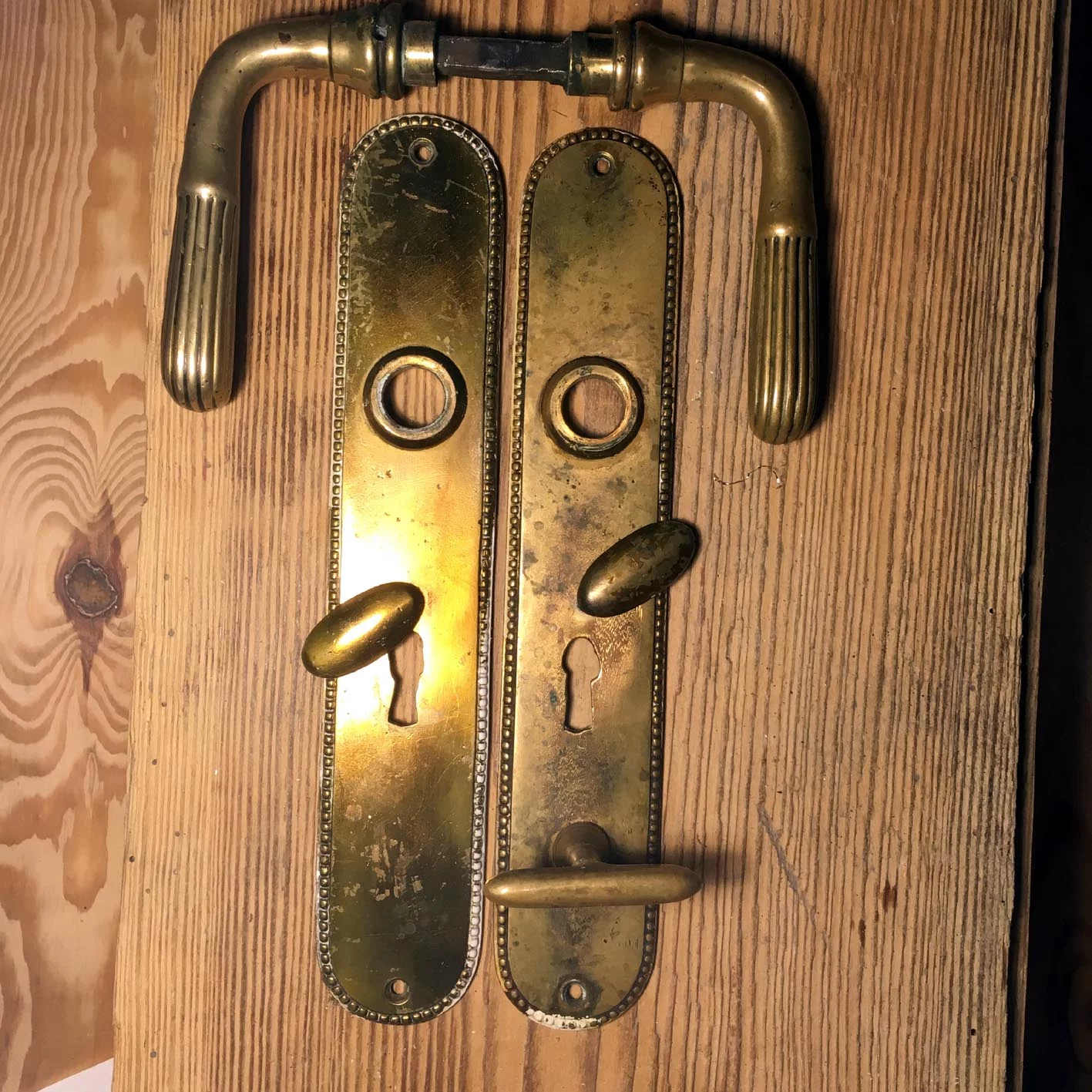 Zumteil ist noch die Original Beschichtung mit der diese Drückergarnitur überzogen wurde vorhanden.
