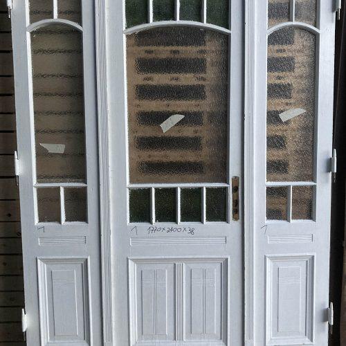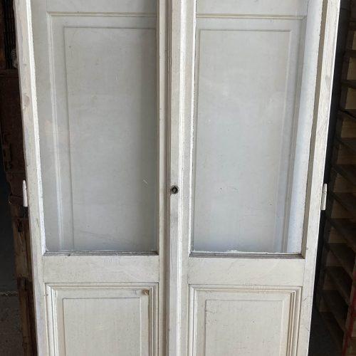Schiebetür Doppelflügel Nr. 520-2 Epoche: Gründerzeit Material: Kiefernholz Aufteilung: 4 Kassetten Glas: Ja Höhe / Länge: 2575 mm Breite: 1000 mm Stärke / Dicke: 80-105 mm Zustand / Beschreibung: Guter zustand, Farbe Blättert ab, im oberen Aufteilung mit Glas, vermutlich hat die andere hälfte wegen Vandalismus in dem Haus nicht überstanden. Gewicht: 100 kg Hier geht es zurück zur Türen Auswahl. VERSANDKOSTEN NACH ABSPRACHE/VEREINBARUNG. -