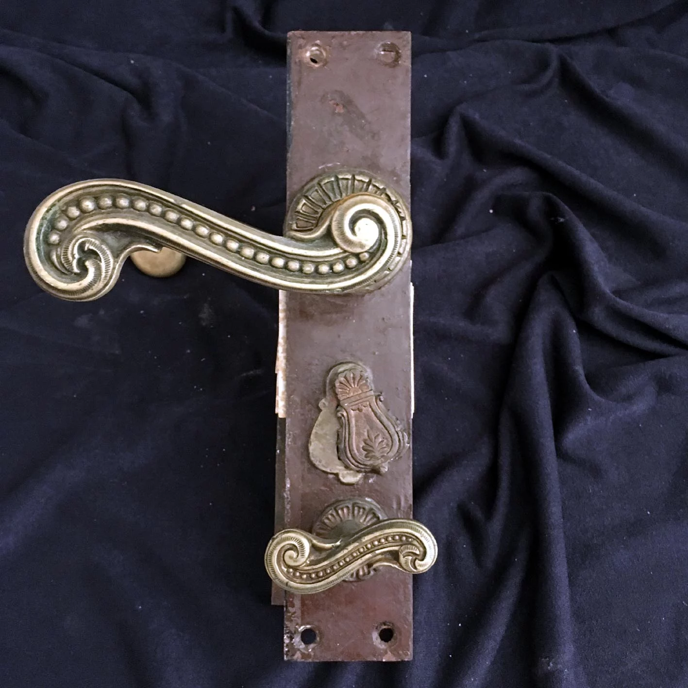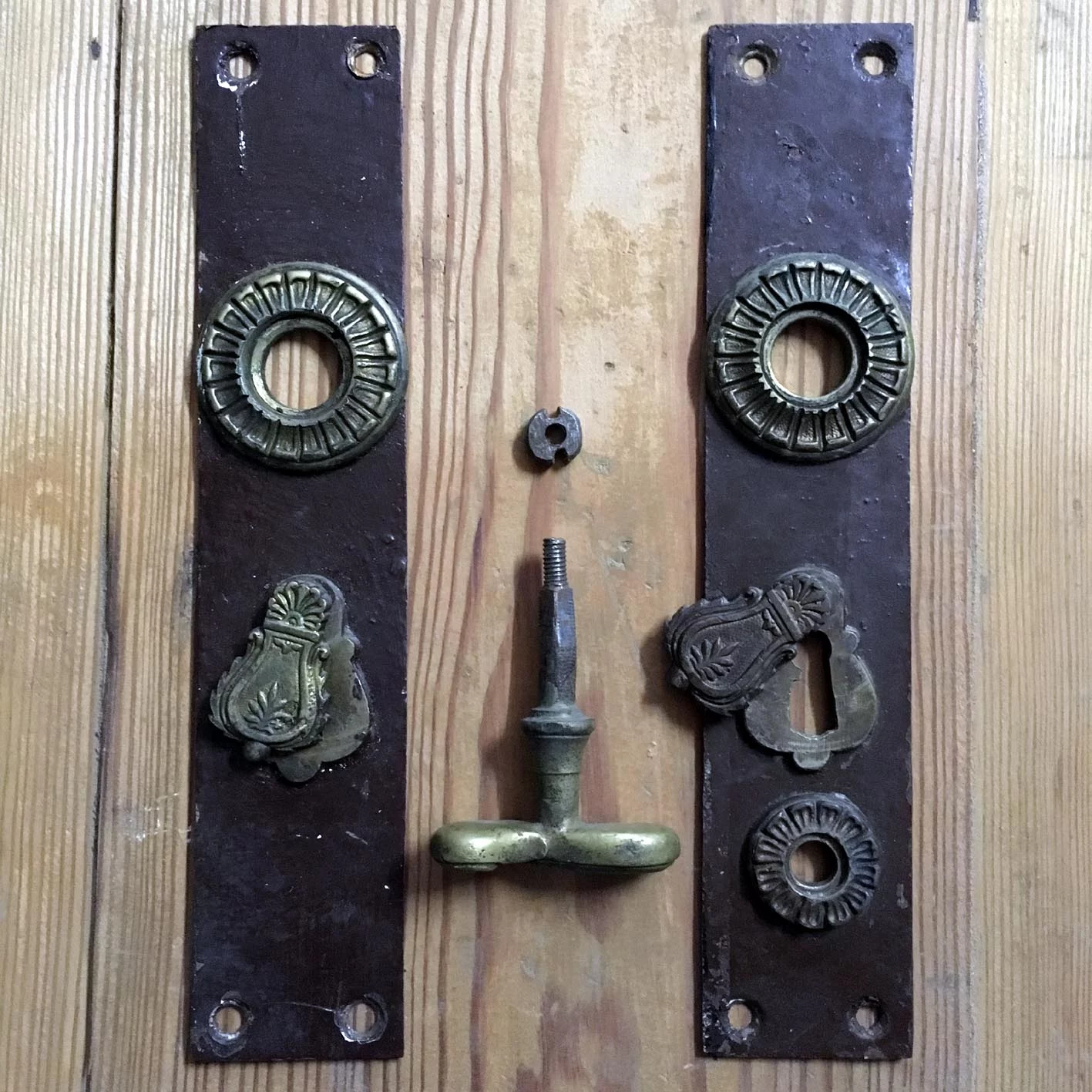 Original Historismus Drückergarnitur Metallschild mit Messing Schlüsselloch Rosette & Nachtschließer.