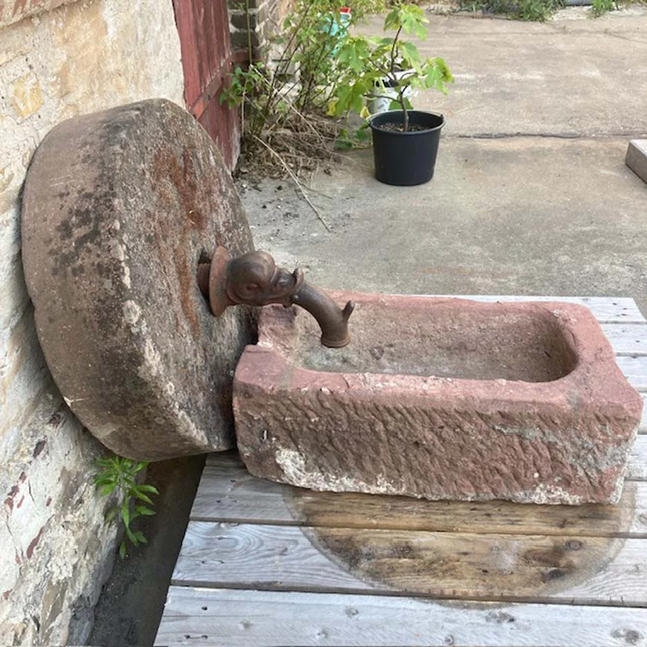 Wasserspiel bestehend aus Mahlstein / Mühlstein, Kleiner Futtertrog aus Wesersandstein , Mainsandstein , Bebertalersandstein bzw. Schlesischer Sandstein und Gusseisernenwasserspeier fischkopf. wir habe diesen in Breslau (PL) ehemals Schlesien erworben.